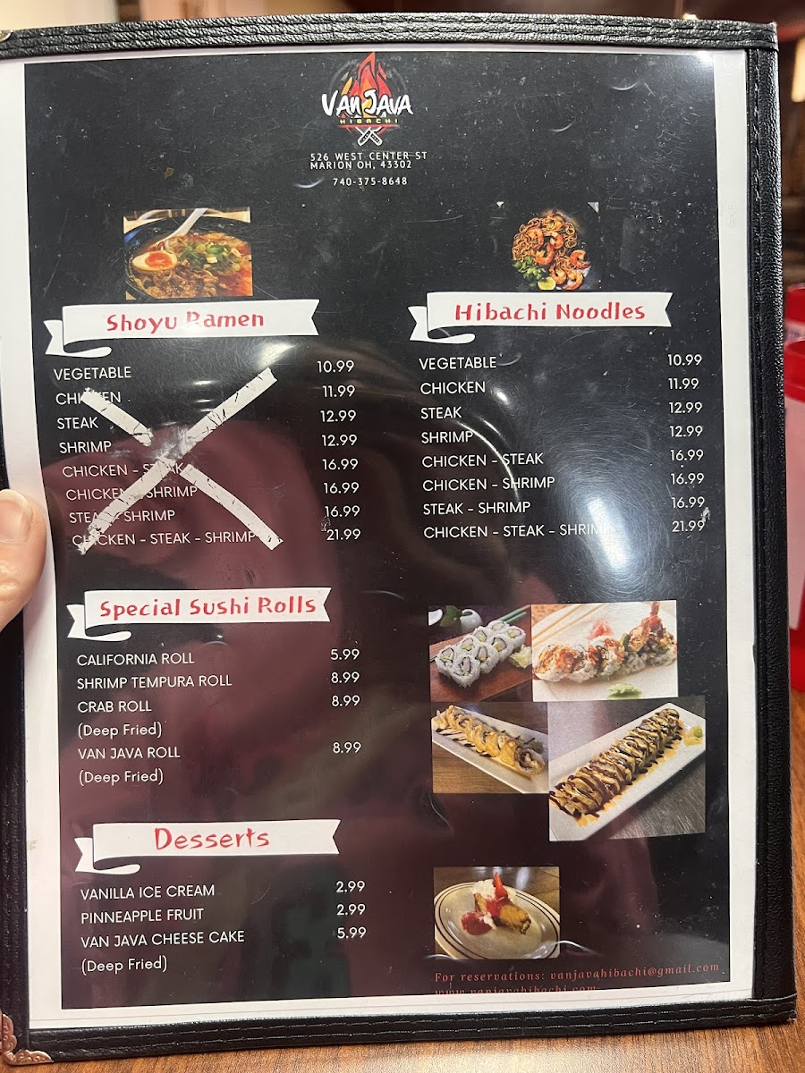 For inquiries or to place an order, give them a call at (740) 297-9860. Such a dining experience awaits you here at Van Java Hibachi.